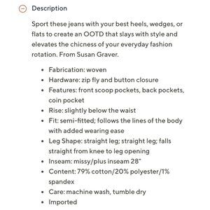 Elevate your casual wardrobe with these Susan Graver straight leg jeans. The dark wash and solid pattern make them versatile enough to pair with any top. The jeans are made of a blend of polyester, spandex, and cotton, ensuring both comfort and durability.