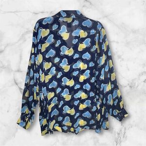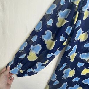 The Susan Graver Style Blouse in 2X size features a blue and yellow heart design, making it a romantic and love-themed piece perfect for various occasions such as travel, parties, casual wear, or work/business attire. Hearts outlined with metallic silver accents. Very cute!This blouse has a collared neckline, long balloon sleeves, and a button closure for a stylish and relaxed fit. Made of polyester chiffon fabric, it is machine washable for easy care. The colorful theme and elegant details make this blouse a versatile and chic addition to any woman's wardrobe.