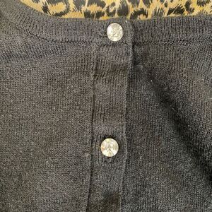 Keywords: black cardigan, leopard print lining, button front, long sleeve, ribbed trim, silver buttons, animal print, classic style, layering piece, winter fashion, fall fashion, womens sweater