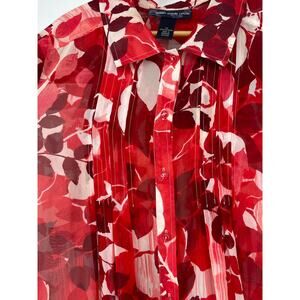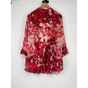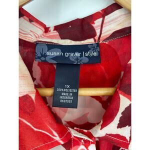 Susan Graver Style Red White Floral Pleated Button Up Tunic Top 1X Boho Coastal