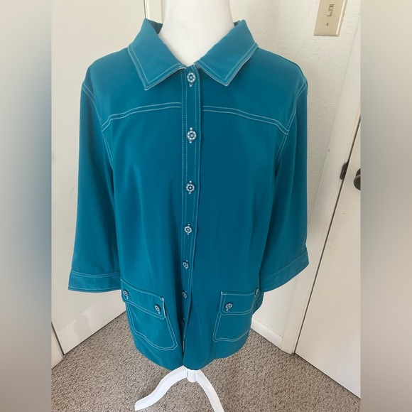 Susan Graver Style Womens Teal Button Front Long Sleeve Blouse Size 1X