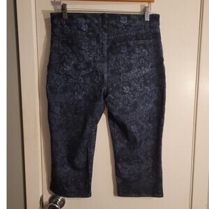 Susan Graver Sz 8 Jacquard Ankle Pants Navy Blue Floral Slim Stretch Career