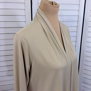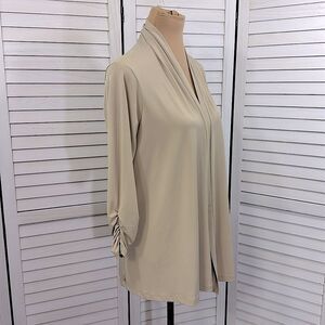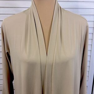 Elegant open front cardigan. Soft flowy fabric with a relaxed fit. Perfect for layering. Ruched 3/4 Sleeves & straight hemline. Stretchy soft liquid knit fabric. Excellent condition & no flaws noted. Machine wash cold & tumble dry low heat.