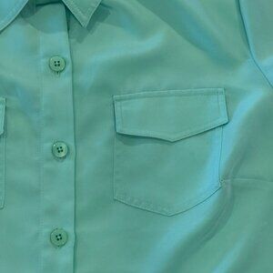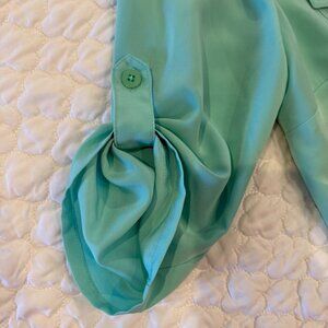 • Susan Graver Teal Loose fitting Roll Sleeve Shirt. Great for travel and easy packing. Liquid Knit 100% Polyester.