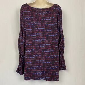Susan Graver Top 2X Brushed Liquid Knit Purple Abstract Geo Bell Sleeve A343073
