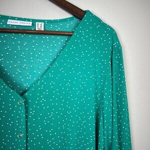 Susan Graver Top Womens 1X Green Polka Dot Button Up Down 3/4 Ruch Sleeve V-Neck