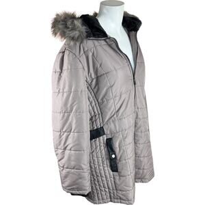 This item is a Susan Graver Water-Resistant Puffer Coat with Faux Leather Detail in the color Thistle. It is a size Large. This coat is in good condition but does spots where the zipper is missing teeth, making it difficult to completely zip/unzip.