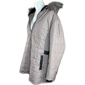 Susan Graver Water-Resistant Puffer Coat with Faux Leather Detail Thistle Large