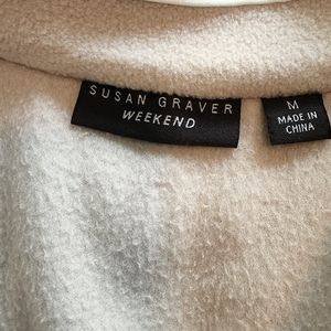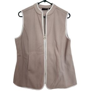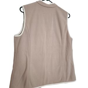 Susan Graver Weekend A285059 tan with white puping polar fleece zip front vest. Features heart shape zipper pull and mandarin collar. Semi-fitted. Chest approximately 21.5 inches laying flat pit to pit. Gently worn in good condition from non-smoking home.