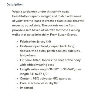 Elevate your wardrobe with this versatile Susan Graver cardigan. Made with a regular jersey knit draped back design, this tight-knit sweater features long sleeves and an open-front style with a flattering fit for any body type. The navy color and solid pattern make it a perfect choice for any occasion, whether it's for travel, party/cocktail, casual or business.