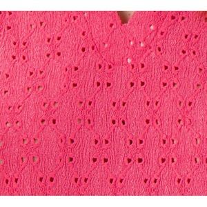 Features: eyelet design, V-notch at neckline, 3/4-length blouson sleeves with elastic at the opening, straight hemline