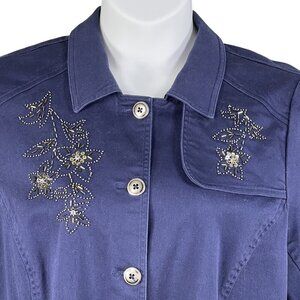 Susan Graver Womens Size 1X Metal Floral 3D Embellished Navy Jacket Button Pockets 3/4 Sleeve Shacket Art To Wear Artsy