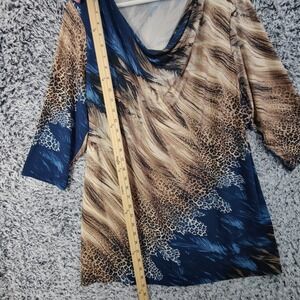 Susan Graver Womens 1X Top Brown Blue Animal Leopard Cat 3/4 Sleeve Cowl Neck