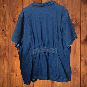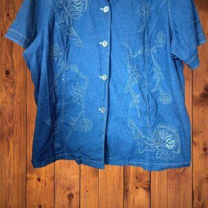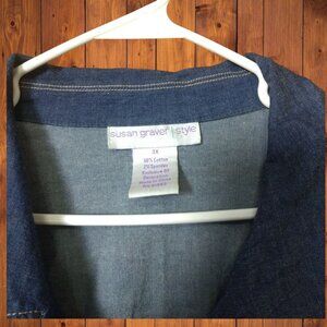 Susan Graver women's plus size 3X button front denim blouse has collar and two front pockets. It has elastic insert in the back. It has embroidered flowers in the front and solid back.