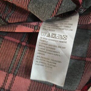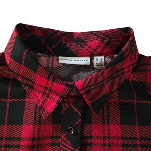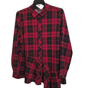 This Susan Graver women's button-down shirt in size 1X features a plaid pattern in red and black, with long sleeves and a collared neckline. The asymmetric hem adds a stylish touch to this tunic-style shirt made from a comfortable polyester spandex blend. Perfect for casual occasions, it is easy to care for with machine-washable material, making it a versatile piece for all seasons. Ideal for women looking for a regular fit and plus-size options.