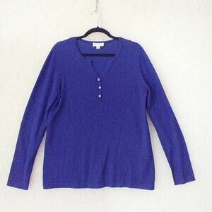 • Features - long sleeves, v-neck. Colbalt blue with gold tone decorative buttons; looks purple-ish in some lighting