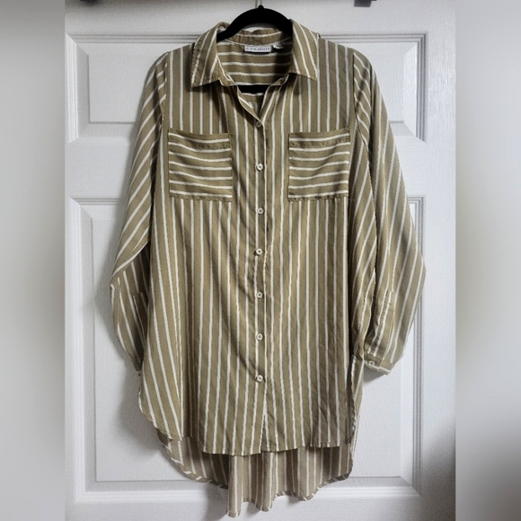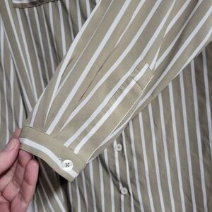 Stylish striped button-up shirt. Features a classic collar and front pockets. Perfect for casual or dressy wear.