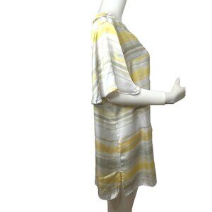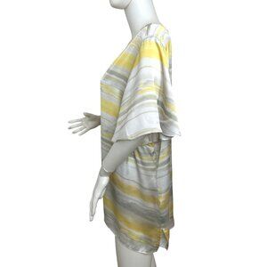0176B- Susan Graver women’s tunic top, XL, made in Vietnam, V-neck, keyhole opening at back neck with band, flutter, short sleeve, gray, yellow, white horizontal stripes in brush strokes. 4.25” side slits. Unlined. Lightweight. Pull on. Chest darts. RN 81893. QVC.