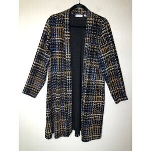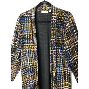 Susan Graver Plaid Houndstooth Open Cardigan Duster Black Blue Gold Knit