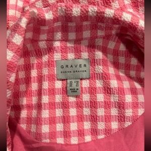 Features: gingham pattern, notch collar, one-button front, long sleeves, fully lined with princess seams, patch pockets