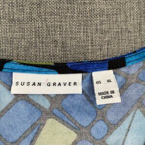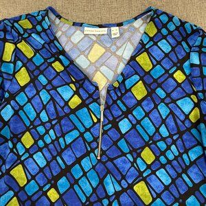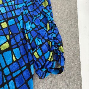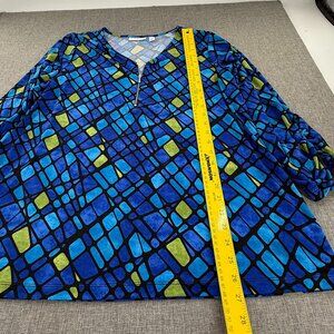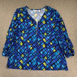 Susan Graver blouse Zipper Blue Green XL Geometric Ruched long Sleeves