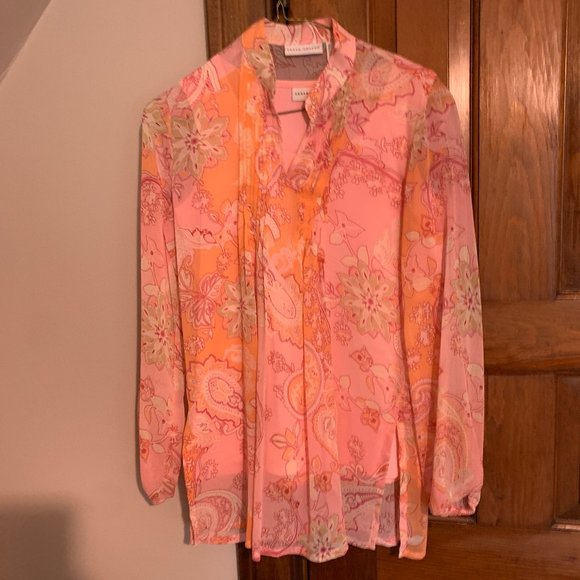 Susan Graver pink and coral paisley long sleeve (slight balloon sleeve) tunic top with pink sleeveless shell, size xxs, brand new without tags, never worn. The photos are a little darker, but the top is pink, (not as orange as the photo.)