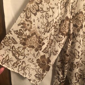 Susan Graver Style Semi Sheer Floral and gold metallic thread pullover blouse. V neck pullover. 3/4 length wide sleeves. Side Slits. Size 3X. 100% polyester. EUC