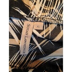 The Susan Lawrence Black Gold and White Print Maxi Skirt is a stylish and versatile piece perfect for various occasions such as travel, parties, or casual outings. Made in the USA, this skirt features a geometric pattern with a front slit and button accents, adding a touch of flair to the design. The polyester-spandex blend jersey fabric ensures comfort and flexibility, while the long maxi length and low rise make it a trendy choice for any season. Machine washable and offering a vintage touch, this skirt is a must-have for any fashion-forward woman's wardrobe. In good condition please review the photos measurements are in them. Has a lot of stretch. Slit in front is 20 inches long.