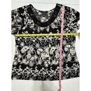 Keywords: Susan Lawrence, black floral top, paisley top, embellished neckline, short sleeve top, womens top, casual top, dressy top, black and white top, floral print top, beaded top, geometric top, V-neck top