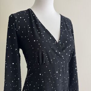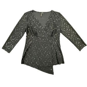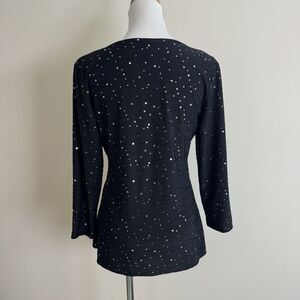 The Susan Lawrence Blouse in size medium is a black top features a V-neckline and 3/4 sleeves. The silver sparkle accents add a touch of glamour, making it a perfect choice for a night out or a special occasion. The crossover faux wrap look adds a unique twist to this basic yet chic blouse from the designer brand Susan Lawrence.