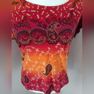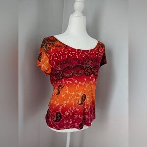 This vibrant top is filled with beautiful reds and oranges. Short sleeve, scoop neck