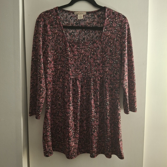 This Susan Lawrence tunic blouse features a relaxed fit with a beautiful pink floral multicolor perfect for adding a touch of elegance to your wardrobe. The 3/4 sleeves and flowing design make it a versatile top for any occasion. Crafted with a slight sheen and square neckline, this tunic offers both style and comfort. Size medium. pit to pit measures 19 inches. Length 28 inches.