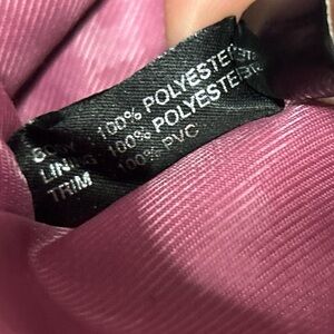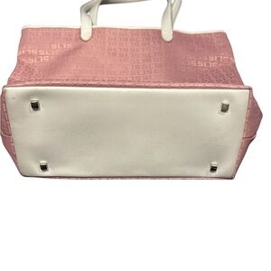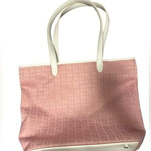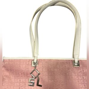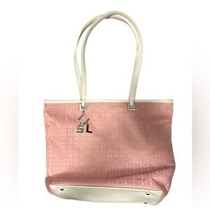 This is a Susan Lucci large pink and white shoulder bag made of polyester with a pink lining. This beautiful purse is like new in excellent condition. It features a zip closure, inside zip slip pocket and accessories pockets. Features faux leather white handles/straps and silver hardware with signature initials. The exterior color is pink, and the lining material is polyester. The bag is designed for women and has a classic style.