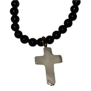 Elegant black beaded necklace with cross pendant. Matching cross earrings included. Perfect for any occasion.