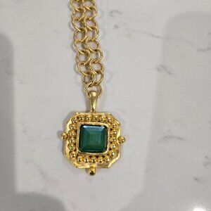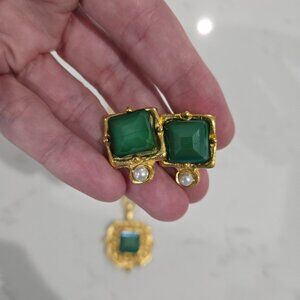 This stunning necklace set features a luxurious gold chain with a captivating green pendant and matching earrings. Perfect for adding a touch of elegance to any outfit.