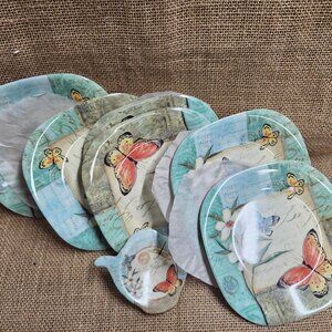 This sweet seven piece set of appetizer plates and tea bag rest are made by Susan Winget. Still in the original box this butterfly springtime pattern is perfect for a small tea party. They are made of melamine and are light weight. Each plate measures 5 x 5.