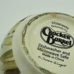 Susan Winget for Cracker Barrel Mug Coffee Mug w/ Yellow Daffodil. Measures approximately 4" high. Preowned excellent condition with no chips, cracks or crazing with the exception of a chip on the bottom rim. There is a bunch of shelf/table wear, some of which can possibly be removed with a little elbow grease. From a non-smoking home.