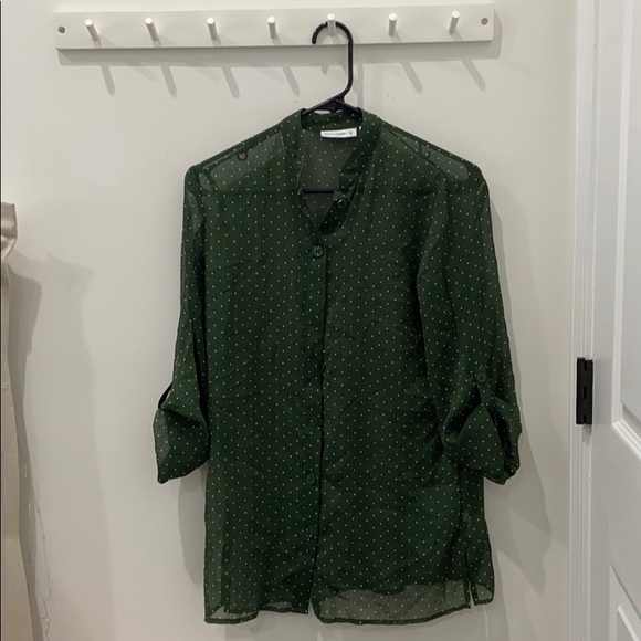 Green with white polka dots, sheet fabric. Roll up sleeves and button down. Not quite tunic length but long. I’ve never worn it. I’m typically a size s/m but it runs big.