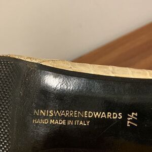 Susa Bennis Warren Edwards handmade pointed toe D’Orsay pumps in beige embossed leather. Covered 3.5 in stiletto heel. Vibram has been added to the sole for comfort.