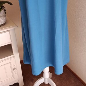 Elegant light blue dress by Susan Graver. Simple "A" shape is elevated with a little bling at the neckline. Pull over. Size L measures 46 at chest, 67 at bottom hem. 42.5 long from slightly padded shoulder to hem. Comfortable and ideal for versatile styling.
