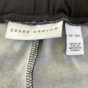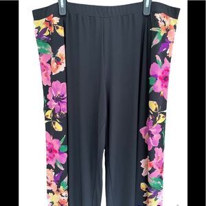 Susan Graver Liquid Knit pull on style palazzo pants, black with floral print, size XLP. Polyester spandex blend, black with floral design going down the outside leg. Elastic waistband, approximate measurements 19”, length from waist approximately 38”, wide leg.