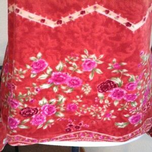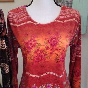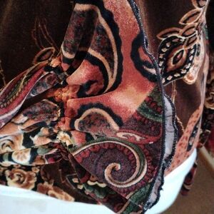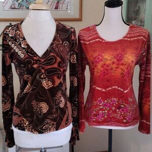 TWO beautiful velour tops. Brown has gathers at chest and ruffled long sleeves. Red is boat neck with long sleeves. Size L measures 36-38 at chest, 38 at bottom hem. Both 24 long from shoulder to hem. Cozy and comfortable and rich.