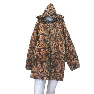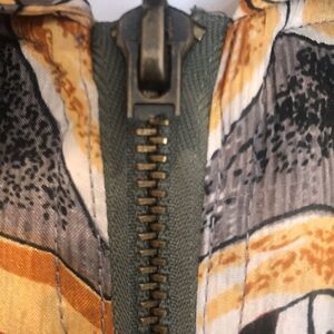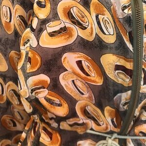 Fully lined with front pockets. Anorak style with hoody. Print is of hats with gold tones, red trim and gray and black blends. Part of Zipper handle is slight broken off. Does not affect usage of zipper and is not noticeable.