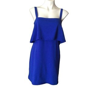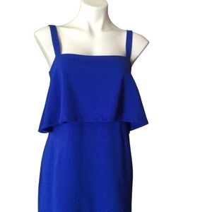 Susana Monaco Sapphire Strobe Tank Dress with tank style straps, has a flap that goes completely around top half of dress to give it an elegant look for date night, weddings, dinner date, dessert has stretch night out on the town Size L Approximate Measurements