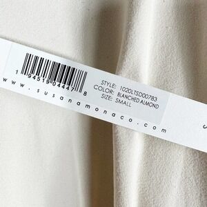 Susana Monaco Tie Panel Gathered Sleeve Dress Cream Blanched Almond. Size Small. New with tag, no flaws. Unlined. Pull-on styling. Front wrap tie accent. Elastic waist and cuffs. Jersey fabric. Measurements are approximates only.