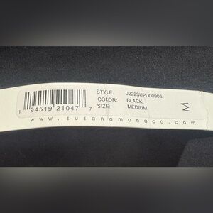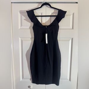 A black off-the-shoulder bodycon dress by Susana Monaco. This dress features a v-neckline and a form-fitting silhouette that ends around the knee. The dress appears to be made of a stretchy material, which is characteristic of Susana Monaco's designs, known for their comfortable and versatile jersey pieces.