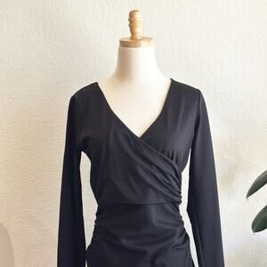 Specific/Style: Pull-over, stretchy material, fitted, gather faux wrap detail, long sleeves