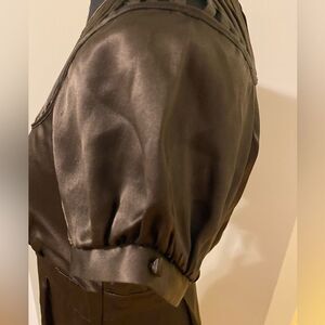 Gorgeous cremini puff sleeves with button embellishments. Cage design at neckline and side zipper. Unlined. Little clasps and snap button on one side of the cage neckline. So classy and elegant