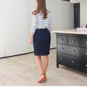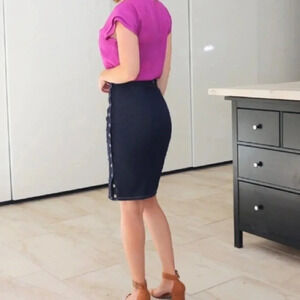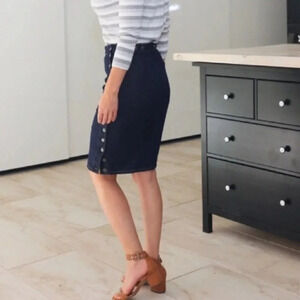 Incredible pencil skirt in denim with cascading button closure along both sides.