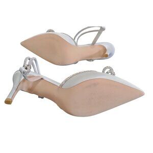 wedding shoes, bridal heels, white satin pumps, rhinestone heels, bow detail shoes, party shoes, high heels, closed toe heels, strappy heels, formal shoes, elegant pumps, anniversary shoes, prom heels